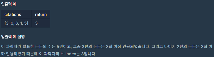어떤 과학자가 발표한 논문 n편 중, h번 이상 인용된 논문이 h편 이상이고 나머지 논문이 h번 이하 인용되었다면 h의 최댓값이 이 과학자의 H-Index입니다.