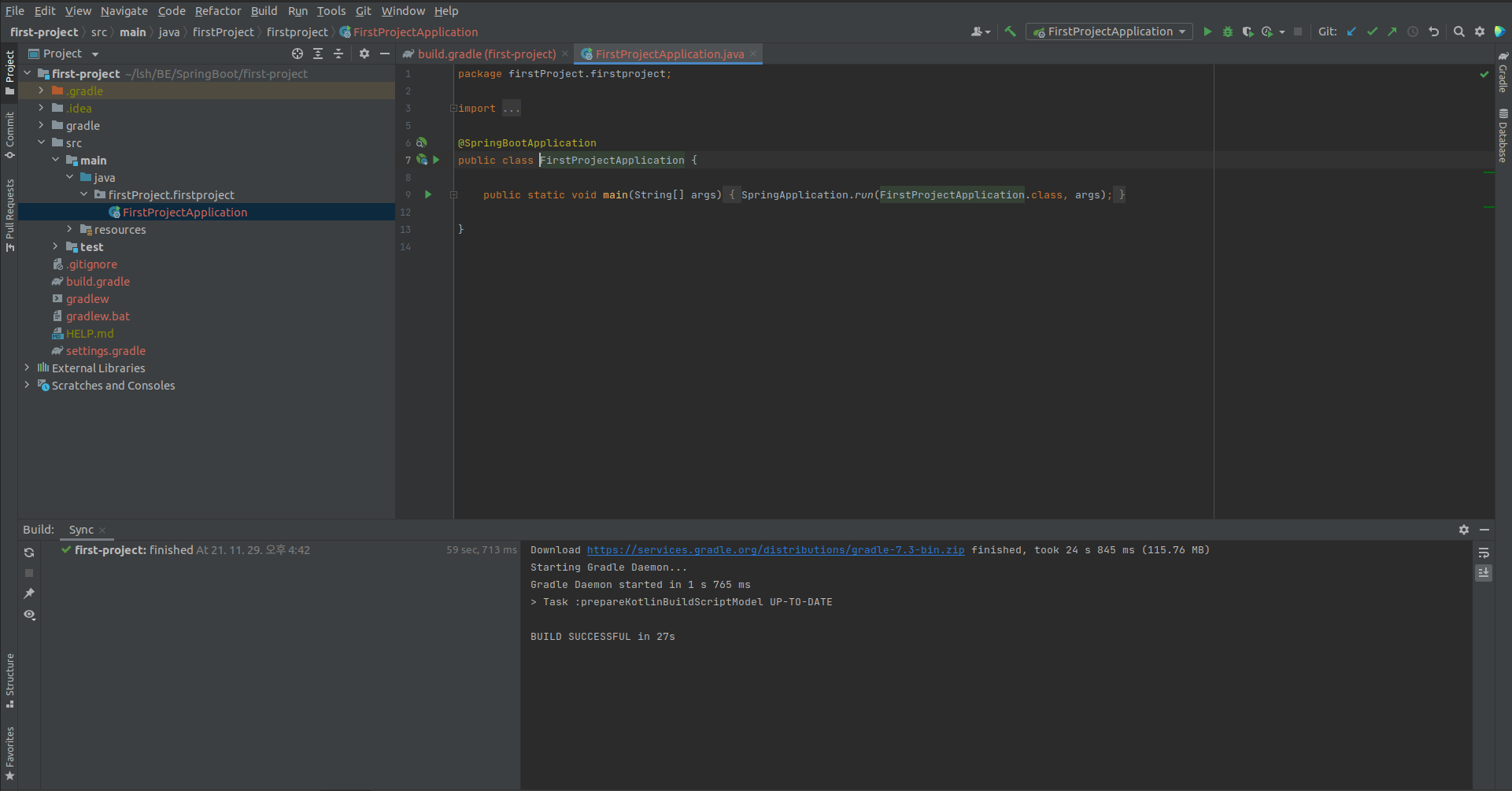 - 이때 아래 창에보면 외부 라이브러리들을 gradle이 다운받고 있는데 이를 기다렸다가 프로젝트를 진행하면 된다.