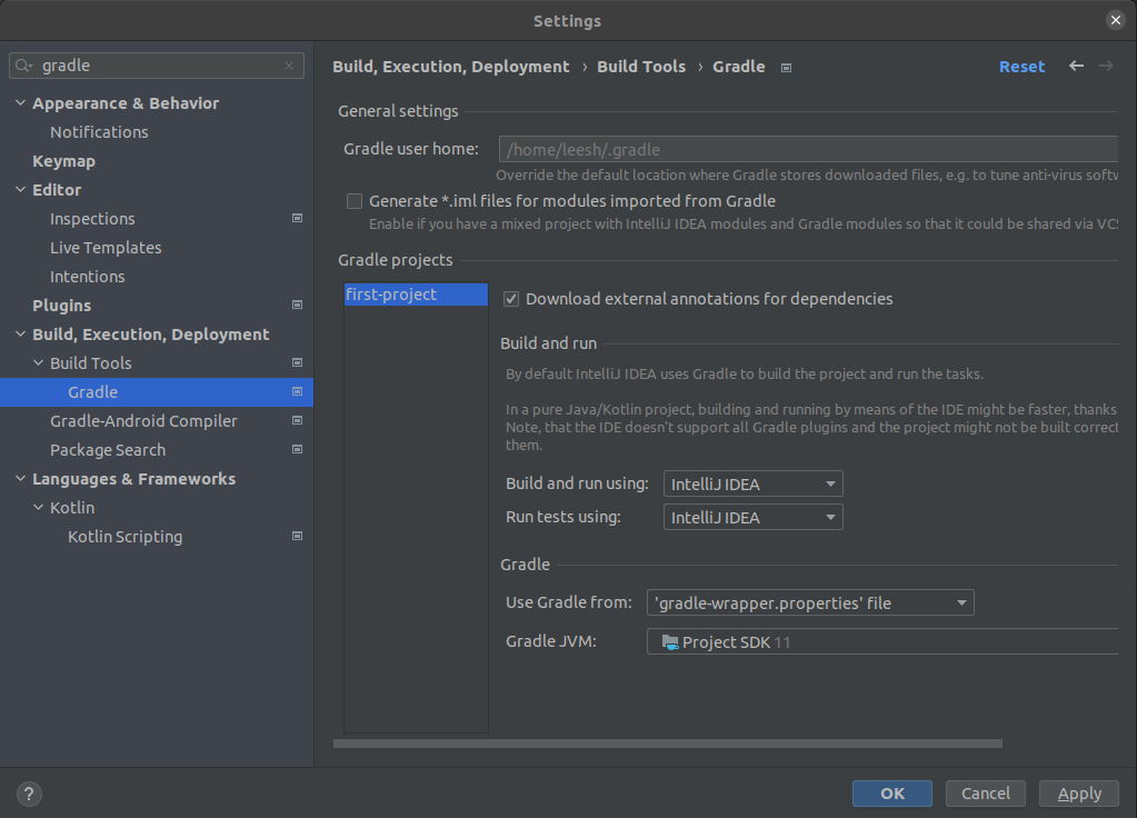 - 우분투 기준 File → Settings에 gradle로 검색하면 아래와 같은 창이 뜨는데,이렇게 하면 실행시 gradle로 실행하게 되어 조금 느릴수도 있기 때문에 이를 아래와 같이