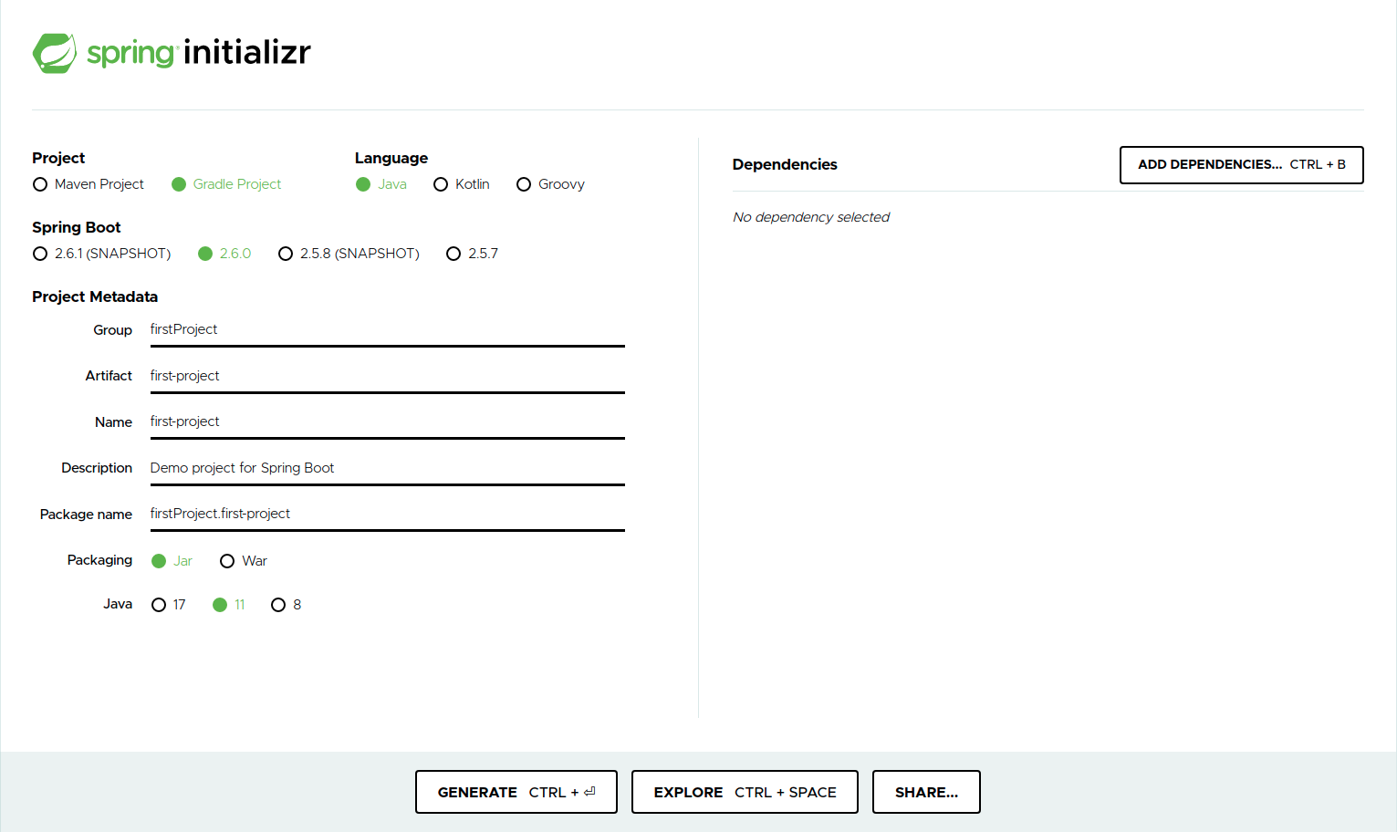 - maven과 gradle의 경우, 라이브러리를 가져와주고, 빌드 라이프 사이클을 관리하는 일종의 툴인데, 요즘에는 gradle을 주로 사용하기 때문에 gradle을 선택해주면 된다.