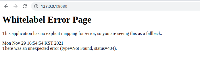 - 설치가 다 되었으면 이제 제대로 되었는지 확인을 위해 프로젝트를 실행해봐야 한다.127.0.0.1(로컬 호스트)에 포트번호8080으로 접속했을때 아래와 같이 뜨면 성공한것이다.(현재는 아무것도 만들지 않아서 404에러가 뜨는 모습이다.)