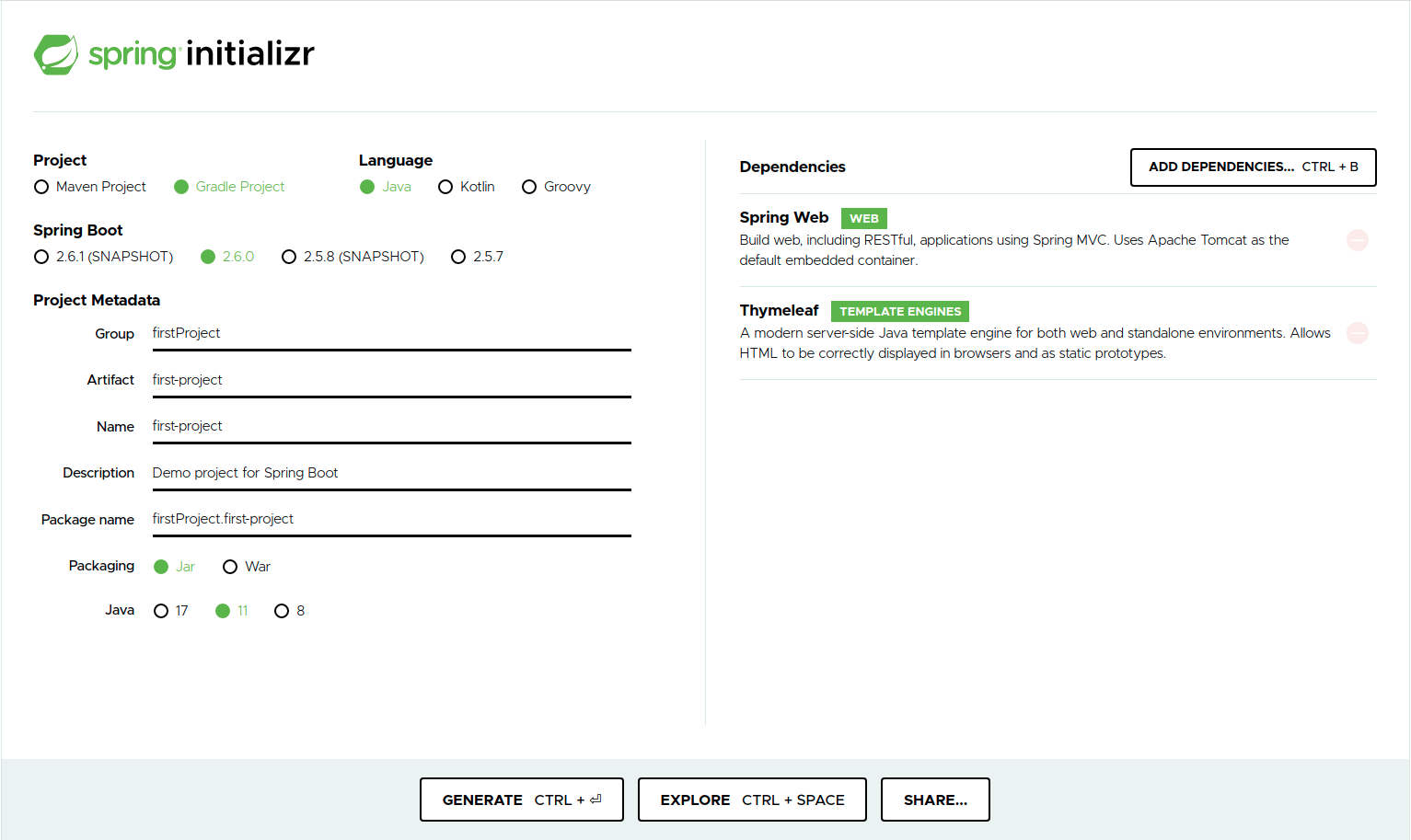 - 이제 우측의 Dependencies를 추가해줘야 한다.ADD DEPENDENCIES 버튼을 눌러서 아래와 같이 추가해주고 GENERATE 버튼을 눌러서 프로젝트를 다운로드 받아준다.thymeleaf : html을 생성해주는 템플릿 엔진