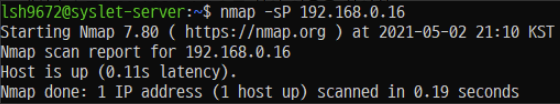 - 대상호스트(192.168.0.16)으로 살아 있음을 확인함.
